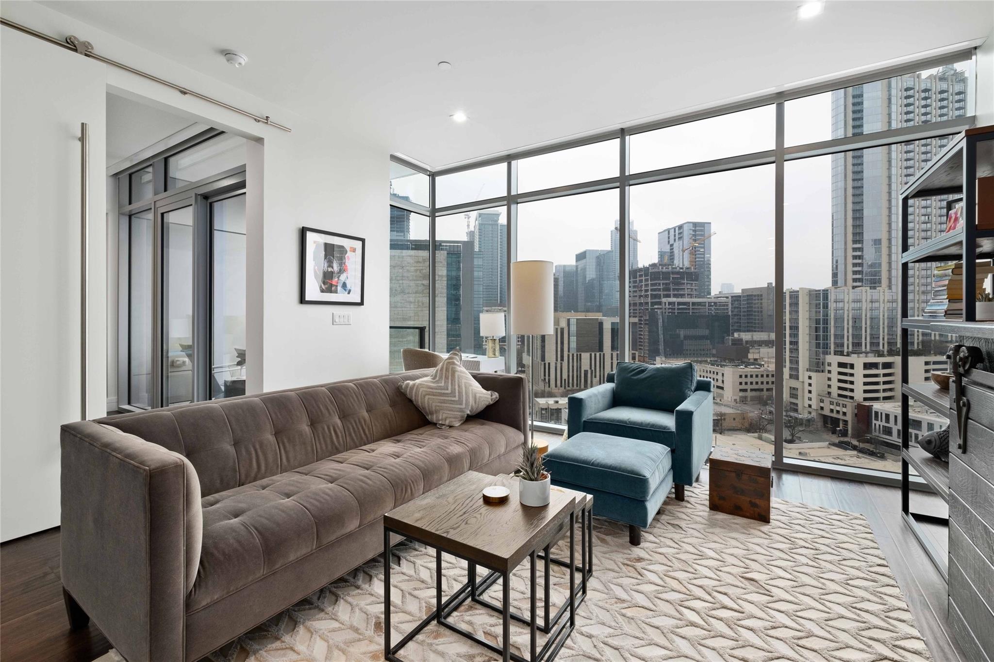 Welcome home to a luxury, light-filled space above Downtown Austin's Market District at Fifth & West Residences. With southeastern views overlooking Austin's dynamic cityscape, you can enjoy the natural beauty of Austin while living in the center of it all. The thoughtfully designed kitchen includes flat-front, Italkraft cabinetry, stainless-steel Miele appliances, quartz-topped island with a waterfall edge and breakfast bar seating. The luxurious appliance package includes double ovens, a built-in wine refrigerator, 5-burner gas cooktop and 36" counter depth refrigerator. The owner's suite is an escape from your busy life and comes complete with blackout shades and an oversized walk-in closet with custom Italian built ins. The marble-clad floors and floating vanity play off the frameless glass shower in your serene full bathroom, which features a pocket door separating the water closet and third vanity, creating the feeling of an additional half bath. Step out onto your private terrace for fresh air and sunset views overlooking Austin. Walls of glass and 9 ft+ ceilings make this 1-bedroom/1.25-bathroom residence feel even more spacious. Dedicated storage, parking for one compact car, keyless entry, and smart home automation complete the picture. Fifth & West reframes the art of living downtown with striking residences, effortless ownership, and a perfect downtown location. Tax and assessed values are estimates for illustration purposes only. All figures should be independently verified. Call or text listing agent to schedule a private showing.